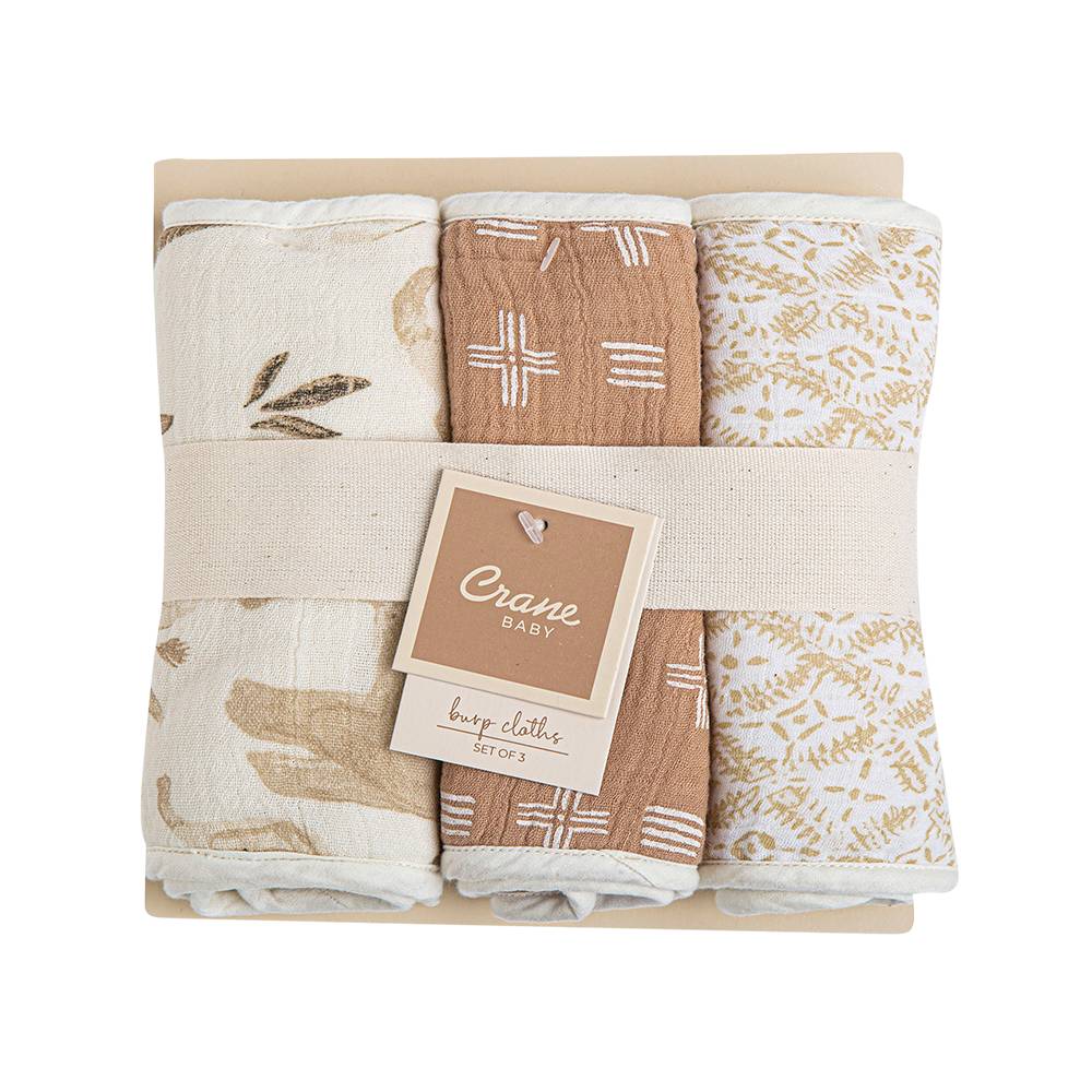 The Crane Baby burp cloths are 100% cotton, lightweight and absorbent. Featuring a cotton terry cloth back and cotton muslin front. Set includes 3 unique...